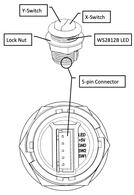 In addition, each 2-in-1 button contains a multi-color LED, based on the WS2812B type of LED, which can have up to 16,777,216 different colors. It can be controlled by any 3rd party WS2812B controller or alternatively with a huge variety of cheap microcontroller development boards (e.g. Arduino, Teensy etc.)